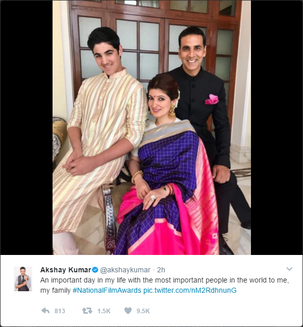 Akshay Kumar is accompanied by his family, wife Twinkle Khanna and son Aarav for the ceremony. Here’s the picture the sweet family.