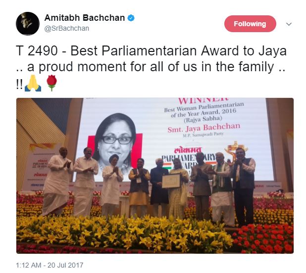 Along with a picture, Big B tweeted, “Best Parliamentarian Award to Jaya .. a proud moment for all of us in the family .. !!??” Well, it is surely a proud moment for the Bachchan family.