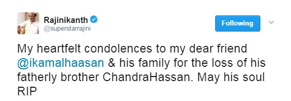 Rajinikanth took to his Twitter handle and offered his condolences writing, “My heartfelt condolences to my dear friend @ikamalhaasan & his family for the loss of his fatherly brother ChandraHassan. May his soul RIP.” [sic]