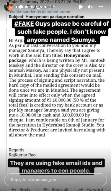 Slamming the fake mail, Rao wrote on his Instagram story, “#FAKE Guys please be careful of such fake people. I don’t know anyone named Saumya.” The actor also wrote, “They are using fake email ids and managers to con people.”