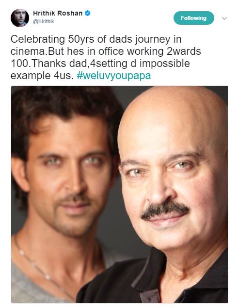 Along with a picture of himself with his father, Hrithik tweeted, “Celebrating 50yrs of dads journey in cinema.But hes in office working 2wards 100.Thanks dad,4setting d impossible example 4us. #weluvyoupapa.” [sic]