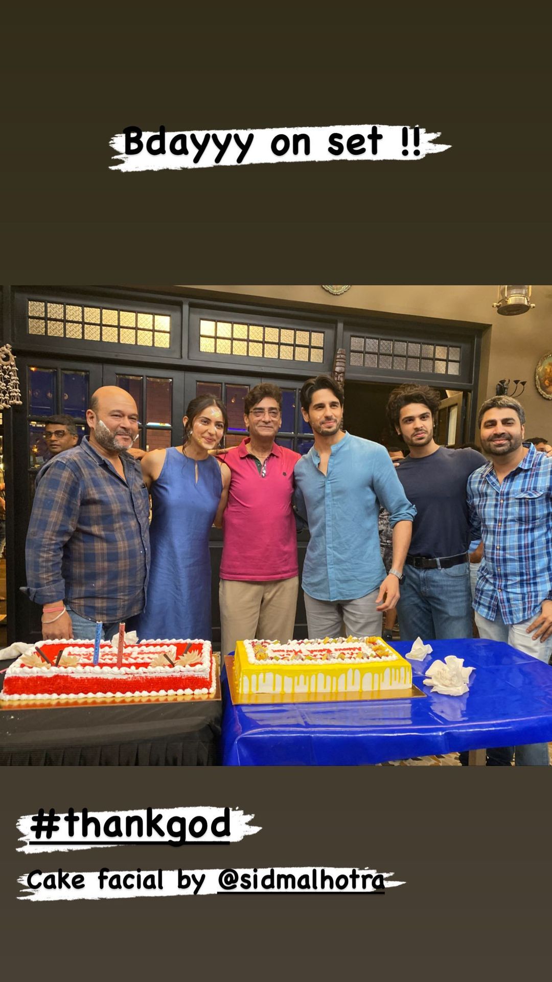 Rakul Preet Singh shared a picture with Sidharth Malhotra Instagram stories. She revealed the cake facial on her face was by Sidharth. The actress celebrated her birthday with the team of Thank God with lots of zeal. She smiled for a beautiful picture, dressed in a blue Kurta. Rakul Singh shared the picture and captioned it, “Bdayyy on set!!” She added a hashtag and wrote, “thankgod“.