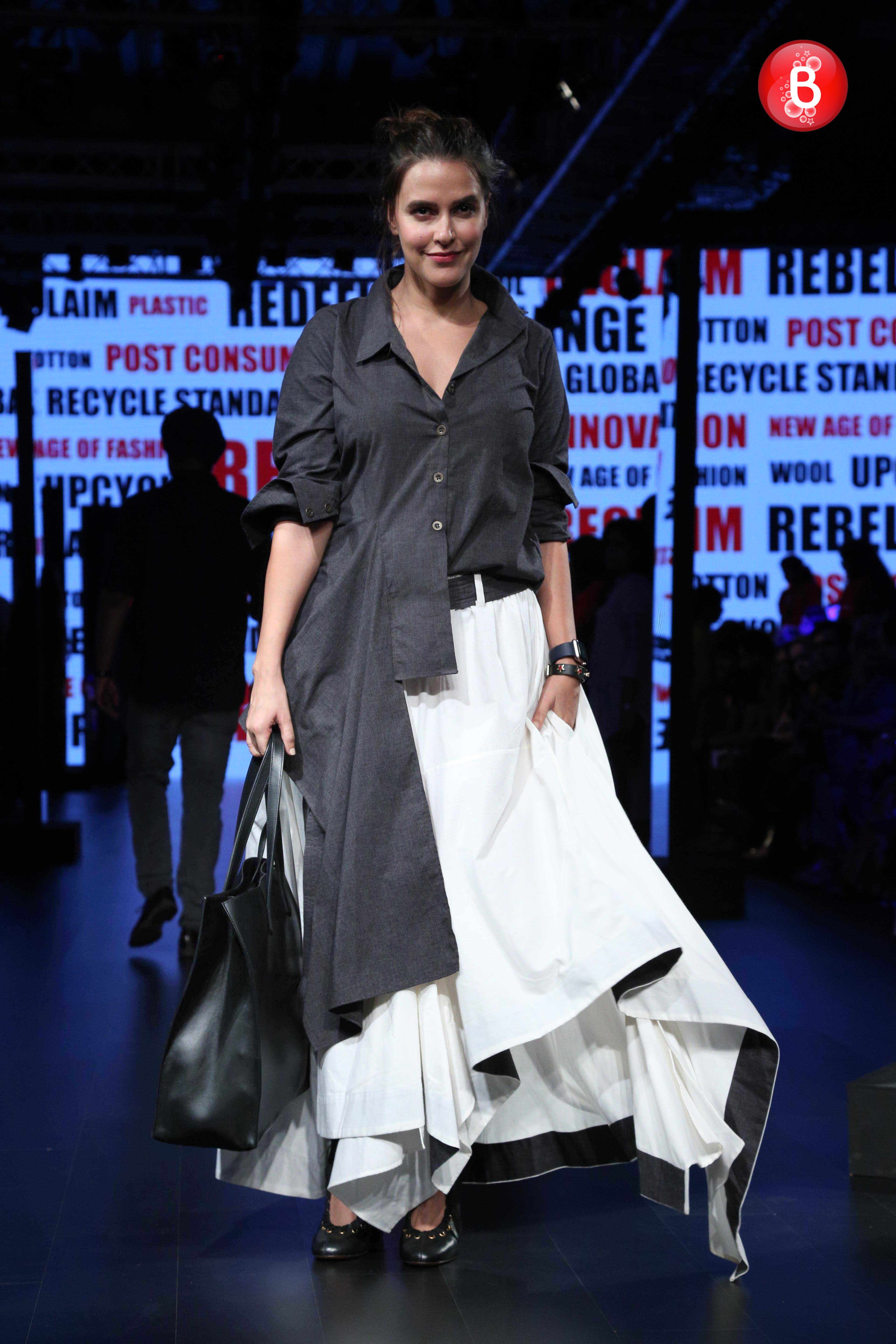 Gracing the fashion event's runway with her presence was actress Neha Dhupia. Wearing something bizarre as usual, Neha opted for a high-low hemline white long skirt along with a black asymmetrical longline shirt. Verdict- We really are confused about what Neha is actually wearing. Apart from her bag, her bold lip colour and those heels, nothing looks flattering at all Style score- 2/5!