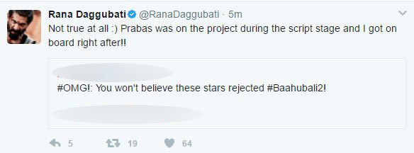 A leading entertainment channel had created a story on actors who rejected ‘Baahubali’. Well, Rana quote retweeted them and stated that the reports are false. He tweeted, “Not true at all 🙂 Prabas was on the project during the script stage and I got on board right after!!” (Also Read: ‘Baahubali 2- The Conclusion’ becomes the highest grossing Hindi film ever)