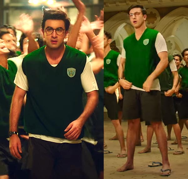 Looking like child and dancing with his hostel mates, Ranbir Kapoor here sports a white tee with a pair of brown 3/4th pants and a sleeveless dark green sweater.