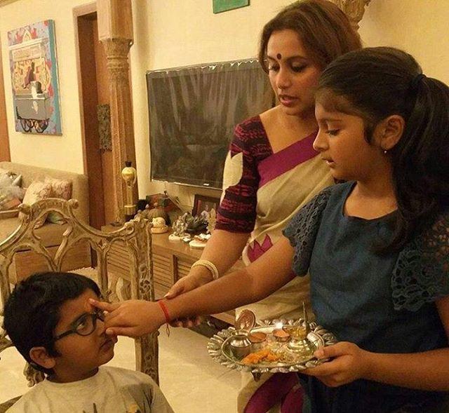 Rani Mukerji, whether decked up or in her natural best, never ceases to woo us. The actress was recently clicked with her nephew and niece on the occasion of bhai dooj. Dressed in a traditional saree and a big round bindi, Rani looked absolutely gorgeous!