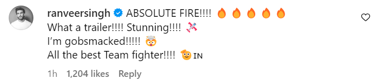 Being a cheerleader for his wife like he always is, Ranveer won hearts with his review of the trailer. He wrote, “ABSOLUTE FIRE!!!! What a trailer!!!! Stunning!!!! I’m gobsmacked!!!!! All the best Team fighter!!!!.” The usage of fire emojis, mind blowing emojis, airplane and salute emojis, just reenforced the actor’s excitement.