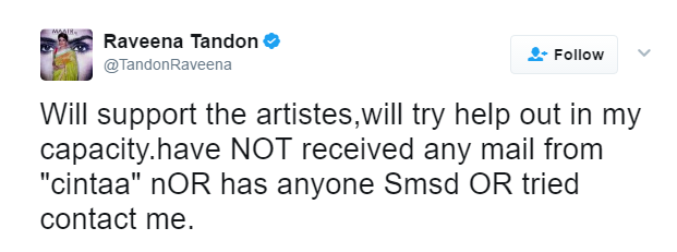 But, the actress has come out in support of the unpaid artistes of the unreleased movie as she tweeted, “Will support the artistes,will try help out in my capacity.have NOT received any mail from “cintaa” nOR has anyone Smsd OR tried contact me.”