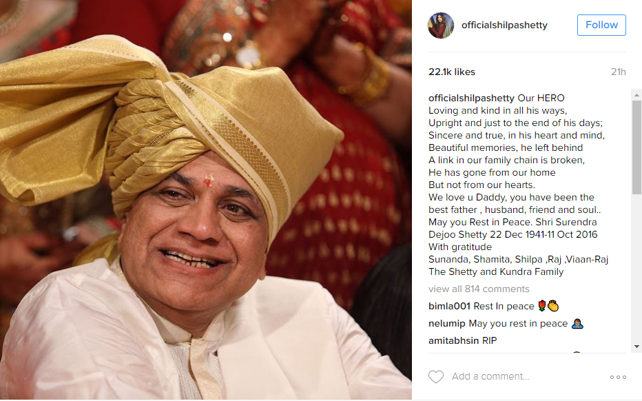 We all know that Shilpa Shetty has been bereaved due to the demise of her father Surendra Shetty, who breathed his last on October 11, 2016. The actress was consoled and the last rites were attended by many Bollywood celebrities.