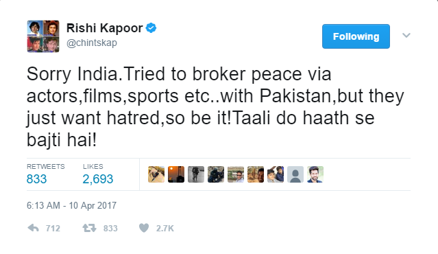 Not just this, he also got in a fight with a Pakistani female who abused him for his tweets. (Also Read:Â Rishi Kapoor gets into a Twitter war with Pakistani women)