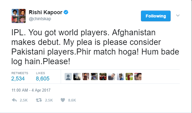 With IPL fever gripping the entire nation, Rishi Kapoor had an opinion on this too. Pakistani players are not a part of IPL and this is what concerns Rishi Kapoor. He had tweeted about the same and urged the organisers to consider Pakistani players too in this match. He meant well and tried to bring two countries closer, but all in vain.