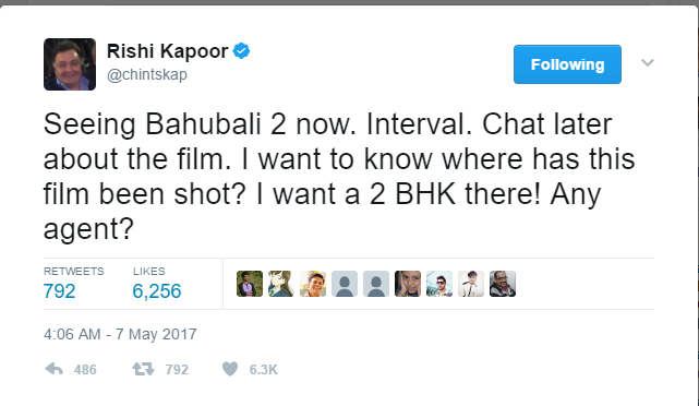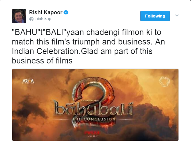 “Jiyo Re Baahubali…” These words are engraved in bold letters in the book of Indian Cinema, forever. SS Rajamouli’s film ‘Baahubali 2 – The Conclusion’, has broken records of every Bollywood film that roared at the box office. The mighty Baahubali conquered his throne and for long he is going to be the ruler of the same. Indeed, it seems to be a task for any upcoming Bollywood film to break the record set by ‘Baahubali 2 – The Conclusion’. And this is something that has been observed by Bollywood’s veteran actor Rishi Kapoor.