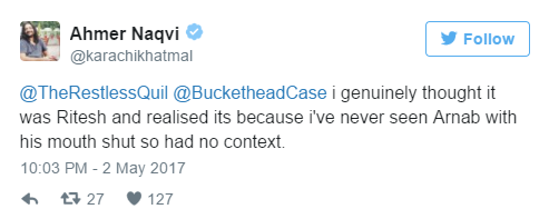 Post Riteish’s tweet, Naqvi clarified his tweet by saying that Riteish’s resemblance to Goswami had confused him. He tweeted, “@TheRestlessQuil @BucketheadCase i genuinely thought it was Ritesh and realised its because I’ve never seen Arnab with his mouth shut so had no context.”