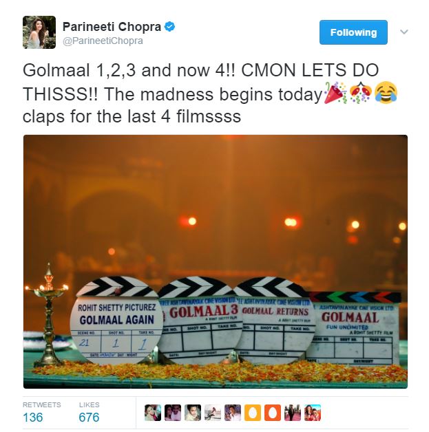 Parineeti Chopra too tweeted, “Golmaal 1,2,3 and now 4!! CMON LETS DO THISSS!! The madness begins today claps for the last 4 filmssss.”