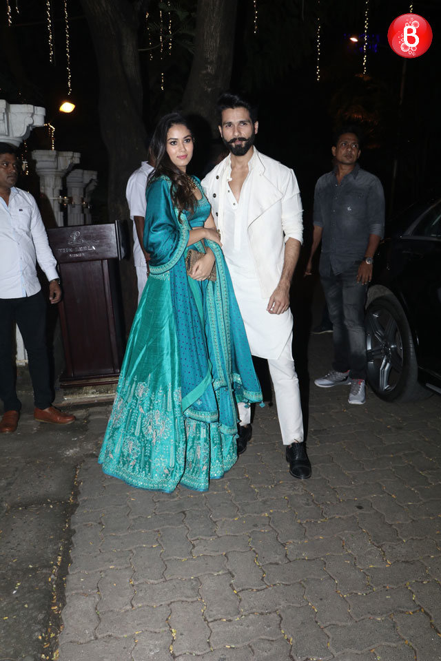 Shahid Kapoor and Mira Rajput, as usual, floored us with their cuteness quotient. The two complimented each other and it is a tough task to not be in awe of this adorable couple. While Shahid wore a beige-coloured kurta and a matching Nehru jacket that he clubbed with black shoes that made him look quite dapper, Mira rocked the ethnic look in this blue-green peacock-coloured lehenga with fine white embroidery all over.