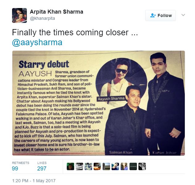 It is said that Salman wants Aayush’s debut to be a big one. The actor feels that his sister’s hubby will be a dashing leading hero. While we were thinking that this might be just another speculation, Arpita took to Twitter to confirm the story. She tweeted, “Finally the times coming closer … @aaysharma.”