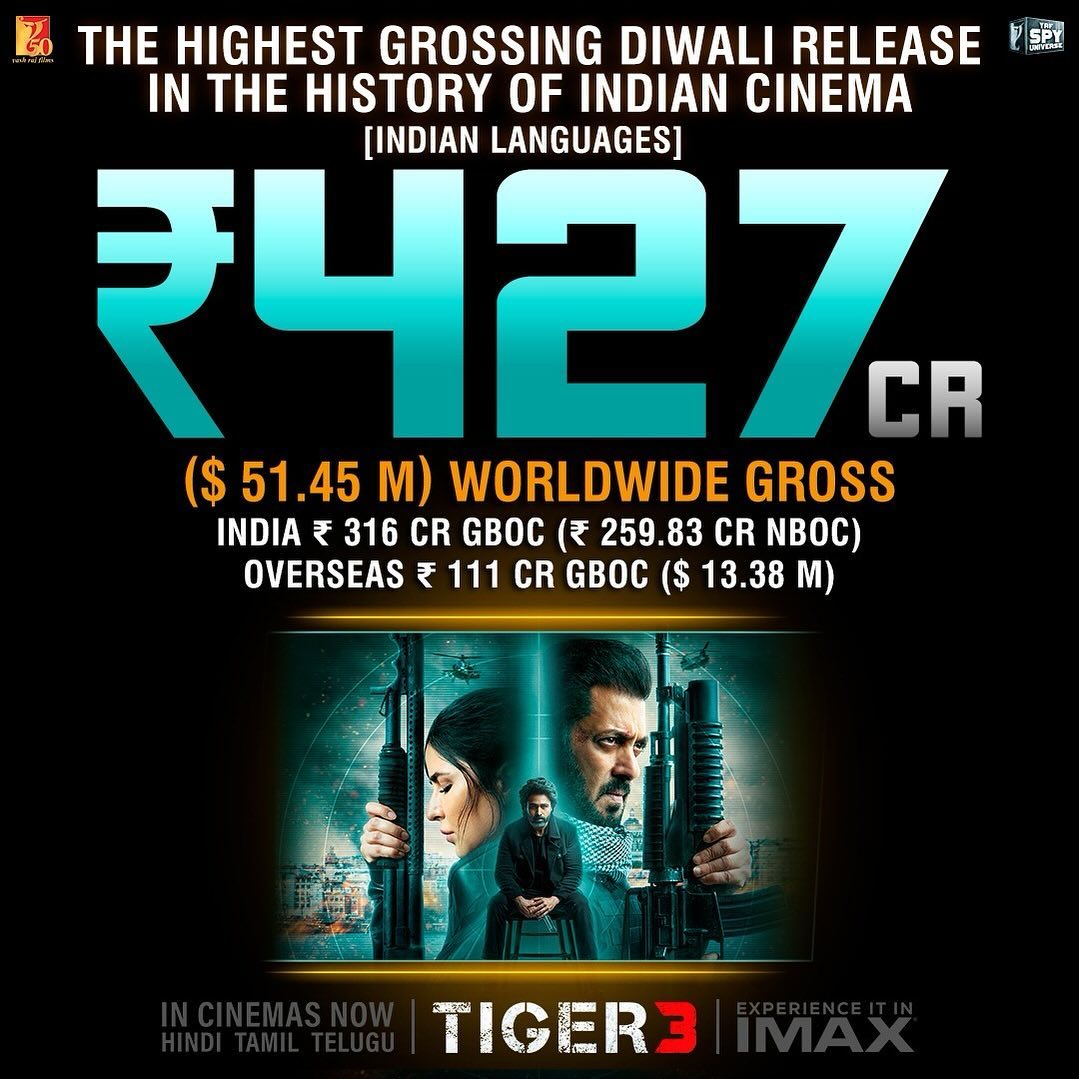 Tiger 3 features Salman, Katrina Kaif and Emraan Hashmi. It is the 5th film in the YRF spy universe and third in the Tiger franchise. Directed by Maneesh Sharma, Tiger 3 released on Diwali this year and emerged a box office success. The film has crossed Rs 260 crores at the cash counters in India and is still going strong. Worldwide, it has crossed Rs 427 crores gross at the box office.