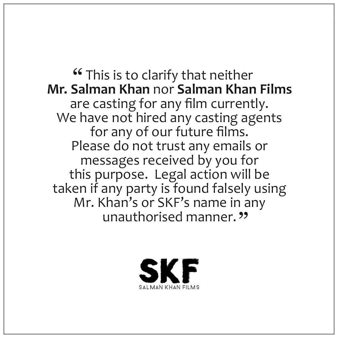 The official note read, “This is to clarify that neither Salman Khan nor Salman Khan Films are casting for any film currently. We have not hired any casting agents for any of our future films. Please do not trust any emails or messages received by you for this purpose. Legal action will be taken if any party is found falsely using Mr. Khan or SRF’s name in any unauthorised manner.”