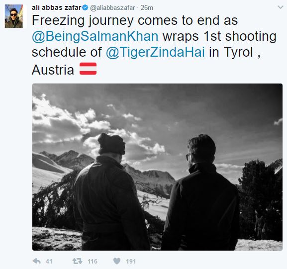 Ali Abbas Zafar took to Twitter to inform his fans about it. Along with a picture from the location, the director tweeted, “Freezing journey comes to end as @BeingSalmanKhan wraps 1st shooting schedule of @TigerZindaHai in Tyrol , Austria.”