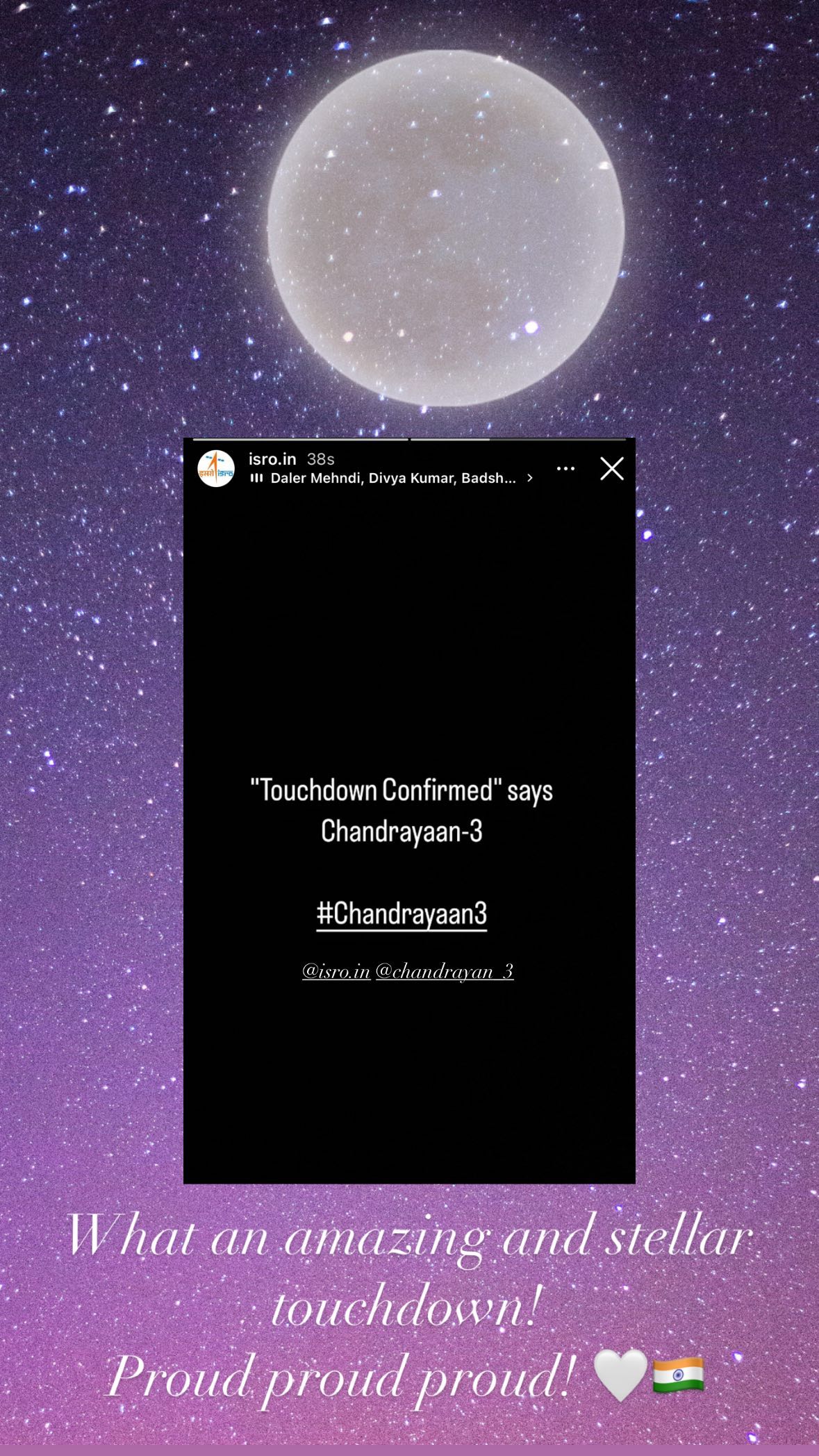 Kartik Aaryan even shared a post on Instagram. The Chandu Champion wrote, “OUR INDIA IS NOW ON THE MOON ?? #Chandrayaan3. HISTORIC MOMENT !! Thank you @isro.in.”