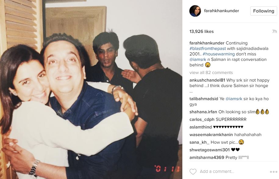 Farah captioned the picture as, “Continuing #blastfromthepast with sajidnadiadwala 2001.. #housewarming don’t miss @iamsrk n Salman in rapt conversation behind.”