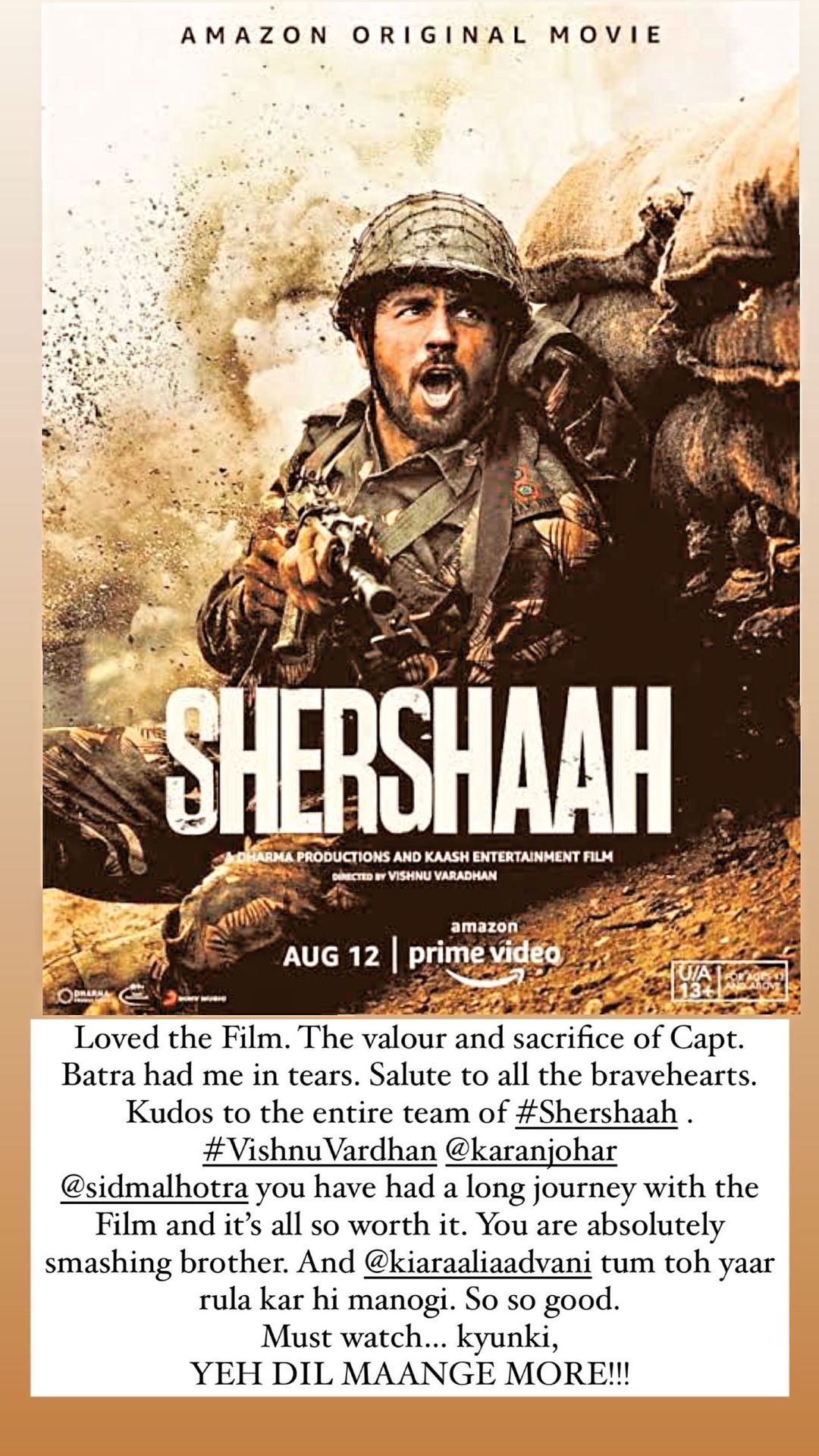 Theatrical experience after a looong time! And this is one film that was exciting to watch on the big screen. #Shershaah — An honest, thrilling, touching story of a braveheart #VikramBatra who made all Indians proud!! Congratulations @SidMalhotra you nailed it!