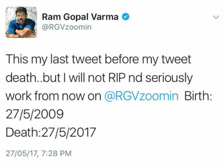 Ram Gopal Varma’s last tweet read, “This my last tweet before my tweet death..but I will not RIP and seriously work from now on @RGVzoomin Birth:27/5/2009 Death:27/5/2017.” [sic]