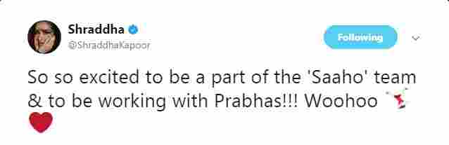 The actress took to her Twitter handle to share her excitement with everyone writing, “So so excited to be a part of the ‘Saaho’ team & to be working with Prabhas!!! Woohoo ��♀️❤.” [sic] (Also Read: Shraddha Kapoor all set to lose weight for ‘Saaho’)