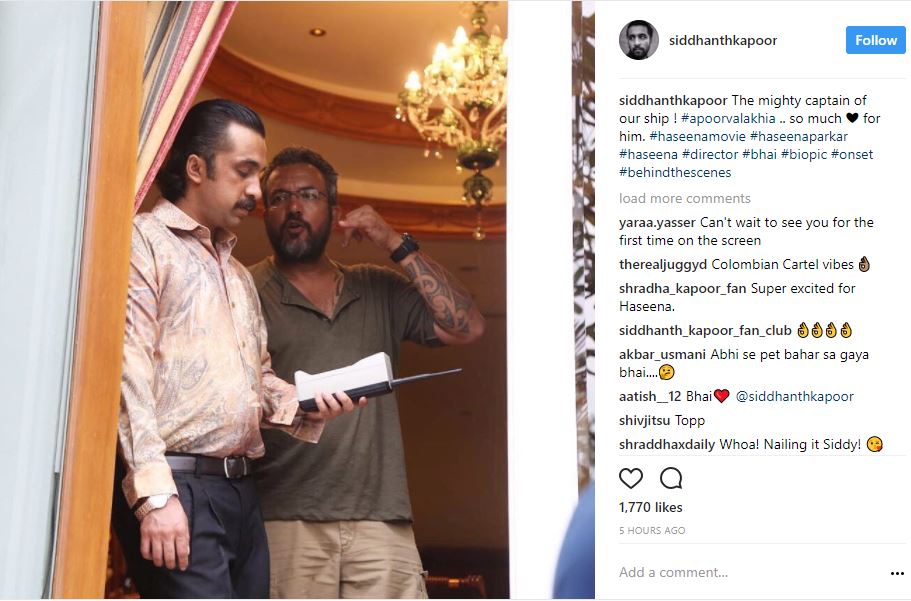 Siddhanth on his Instagram posted the picture and captioned it as, “The mighty captain of our ship ! #apoorvalakhia .. so much ❤ for him. #haseenamovie #haseenaparkar #haseena #director #bhai #biopic #onset #behindthescenes.”