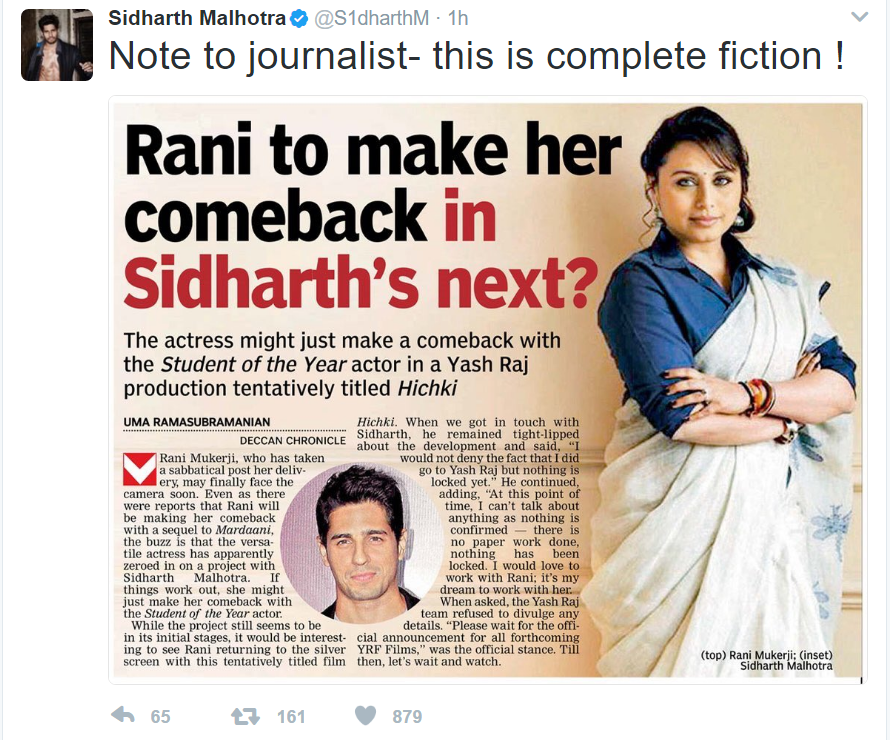 Though there was no confirmation from any of the two over this project, it was being said that a film titled ‘Hichki’ is in the making starring Sidharth and Rani. This film was supposed to be under Yash Raj banner. But calling these stories as fiction, Sidharth in his latest tweet, has rubbished all these reports.