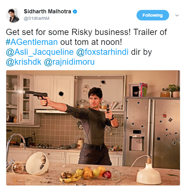 Sidharth shared the picture with the caption, “Get set for some Risky business! Trailer of #AGentleman out tom at noon! @Asli_Jacqueline @foxstarhindi dir by @krishdk @rajnidimoru”
