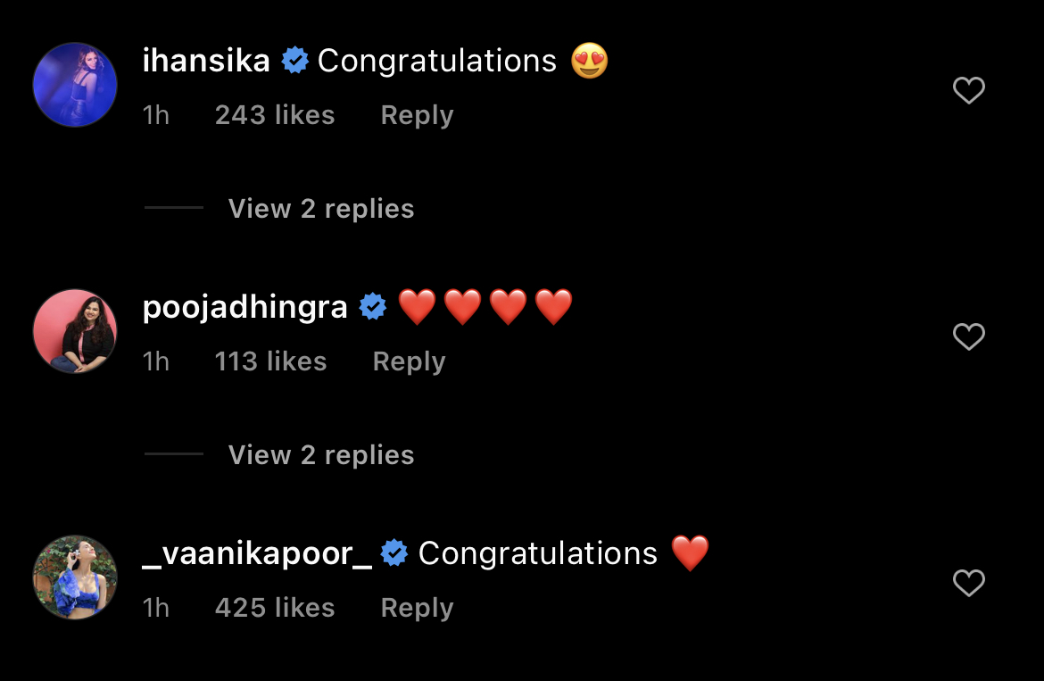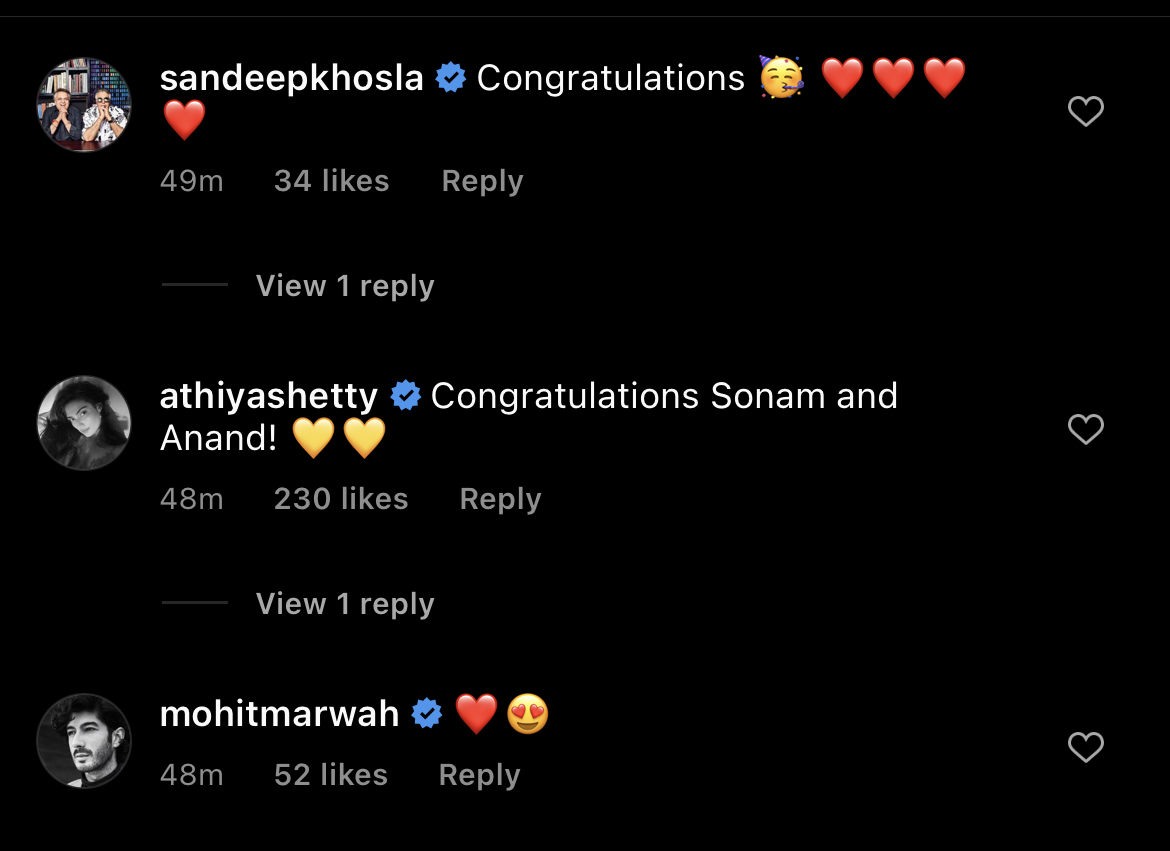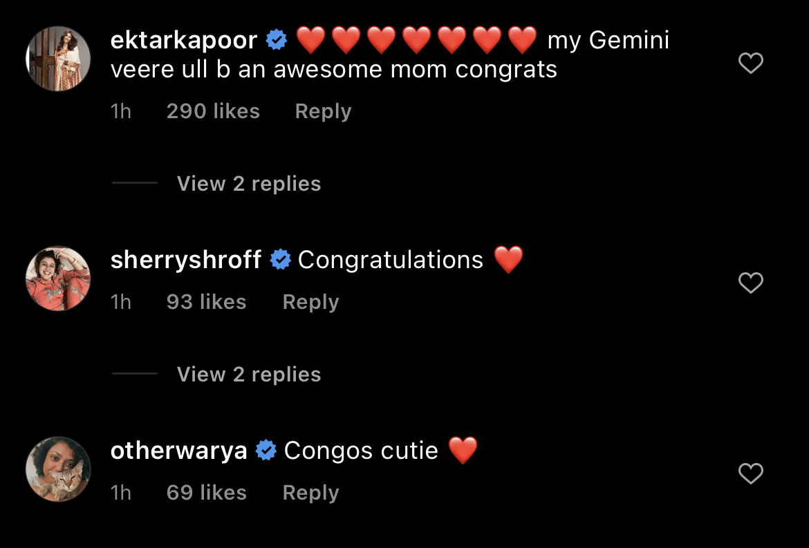 Many Bollywood celebrities like Kareena Kapoor Khan, Ranveer Singh, Janhvi Kapoor, Shanaya Kapoor, Varun Dhawan, Karisma Kapoor, Raveena Tandon, Ananya Panday, Bhavna Pandey, Dia Mirza, Sophie Choudry and many other B-Town stars extended congratulatory wishes in the comments section on Sonam Kapoor and Anand Ahuja’s pregnancy announcement post.