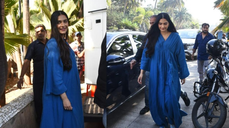 On the style front, Sonam kept it stylish in a blue dress. The actress left her hair open and went for minimal makeup.