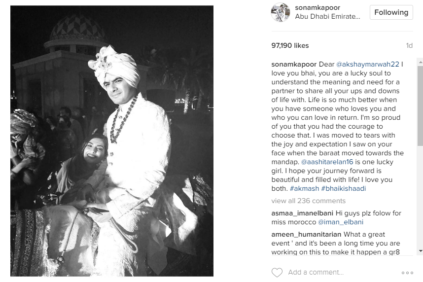 And after two souls tied the knot, Sonam took to Instagram to congratulate her dearest brother. Content with affection, the sentences are dripping love of a sister for her dearest brother.
