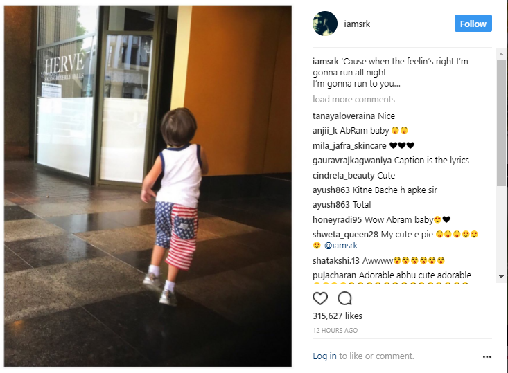 Shah Rukh Khan’s little son AbRam Khan is paparazzi’s favourite starkid. Just like his father, he loves to pose for the cameras and we love it when SRK gets behind the camera to click his candid moments and upload it on social media. Quite often, the King Khan shares adorable pictures of AbRam on social media and all that we could do is go all aww… Once again we are crushing over little AbRam as SRK has shared a cute picture of him on Instagram. The picture has a happy AbRam running all over the place. SRK has made use of one of the famous songs by Bryan Adams, ‘Run to you’.