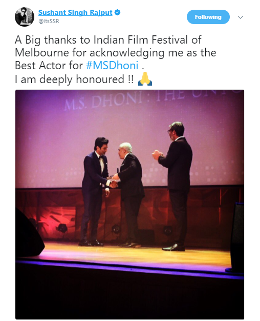 Sushant took to his Twitter handle to share the news and posted a picture from the event where he received the award. He captioned it as, “A Big thanks to Indian Film Festival of Melbourne for acknowledging me as the Best Actor for #MSDhoni .I am deeply honoured !! ?” [sic] (Also Read: Sushant Singh Rajput plans to buy a new home! Read details)