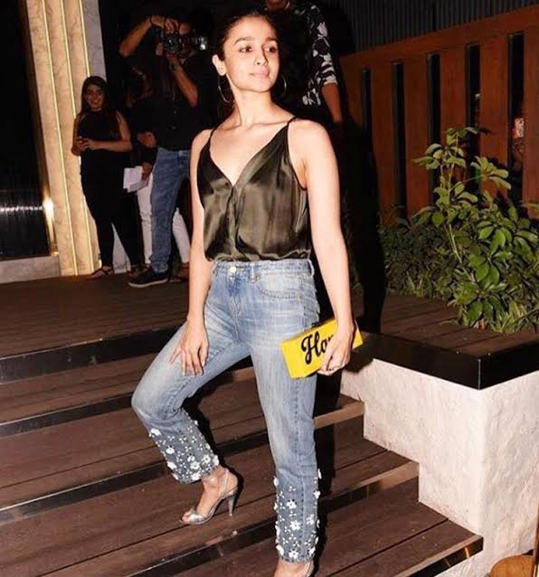 For the occasion last night, Alia opted for a light-blue coloured floral applique jeans by Michael Kors. She paired her jeans with an olive toned tank top from Michelle Mason and she accessorised herself with those metallic sandals from Zara and her 'Happy' Eddie Parker clutch. A pair of hoops, a nude lip and hair tied in a ponytail rounded off her look. We seriously are swooning over Alia's clutch and the jeans, they're so amazing! But, we think that a different kind of top might have added a much better effect. Fashion rating - 3/5