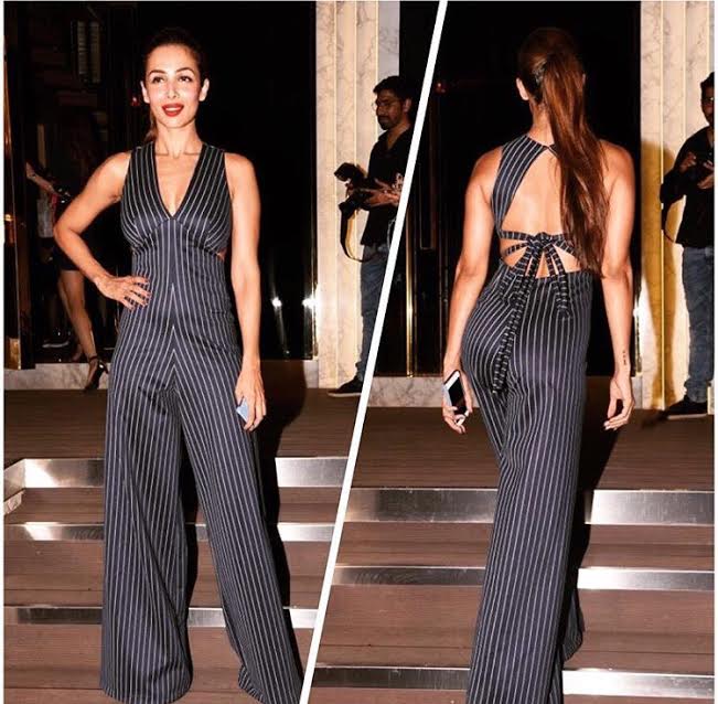 Like always, this sassy lady manages to nail it in every look she flaunts. For Gauri Khan's restaurant launch, Malaika Arora Khan kept it chic with a navy striped jumpsuit. Her Deme by Gabriella jumpsuit with a plunging neckline and that knotty-open back fitted her like a glove. To finish off the look, she went for a ponytail and packed a punch with her red lip. We loved it, you? Fashion rating - 3.5/5