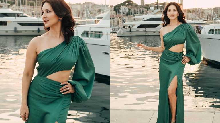 Sunny Leone’s first look reveals her unwavering confidence and determination to conquer the red carpet. She dons a captivating one-shoulder moss green satin dress by designer Maria Kokhia, featuring strategic cuts on her midriff and a thigh-high slit. The dress perfectly accentuates her elegant silhouette, adding a touch of glamour to her ensemble.Complementing her stunning outfit, Sunny adorns herself with exquisite jewellery by Flavia Vetorasso. The jewels elevate her look, adding a touch of sophistication and sparkle.