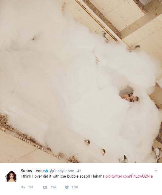 Well, before you think anything else, let us tell you that the actress was having a bubble bath, and used a lot of bubble soap. We think she went quite overboard and even she agrees. Sunny tweeted, “I think I over did it with the bubble soap!! Hahaha.”