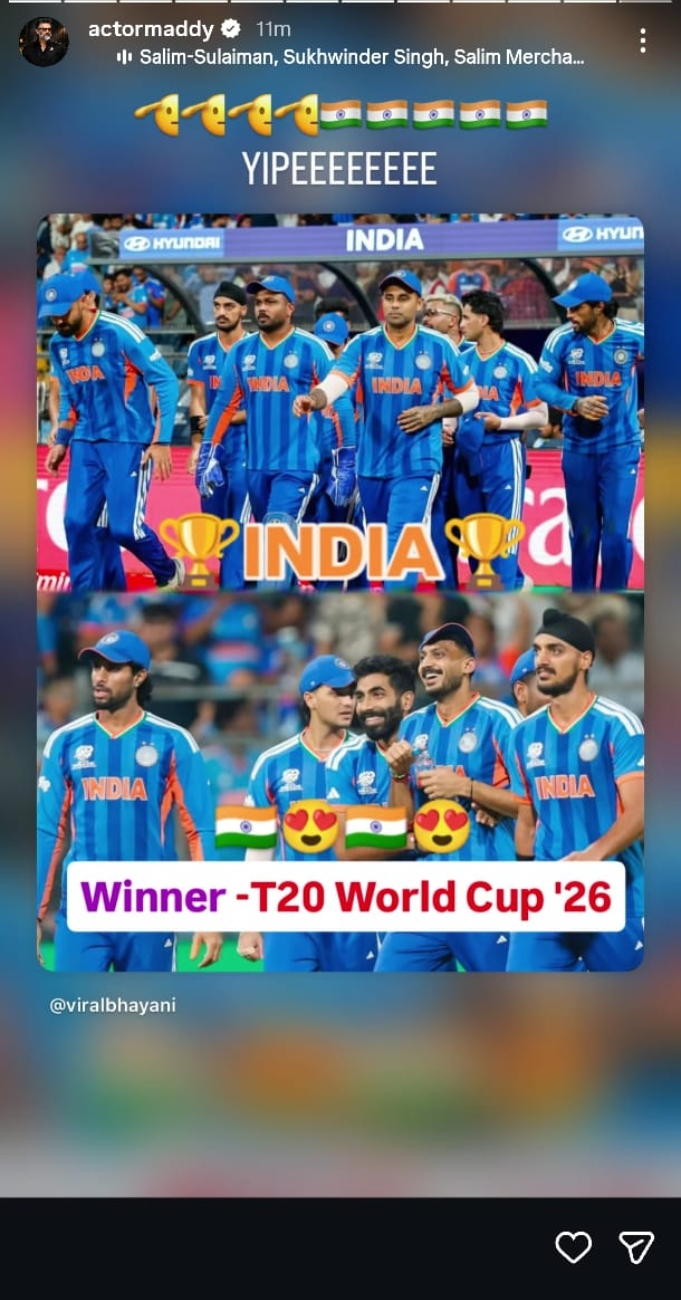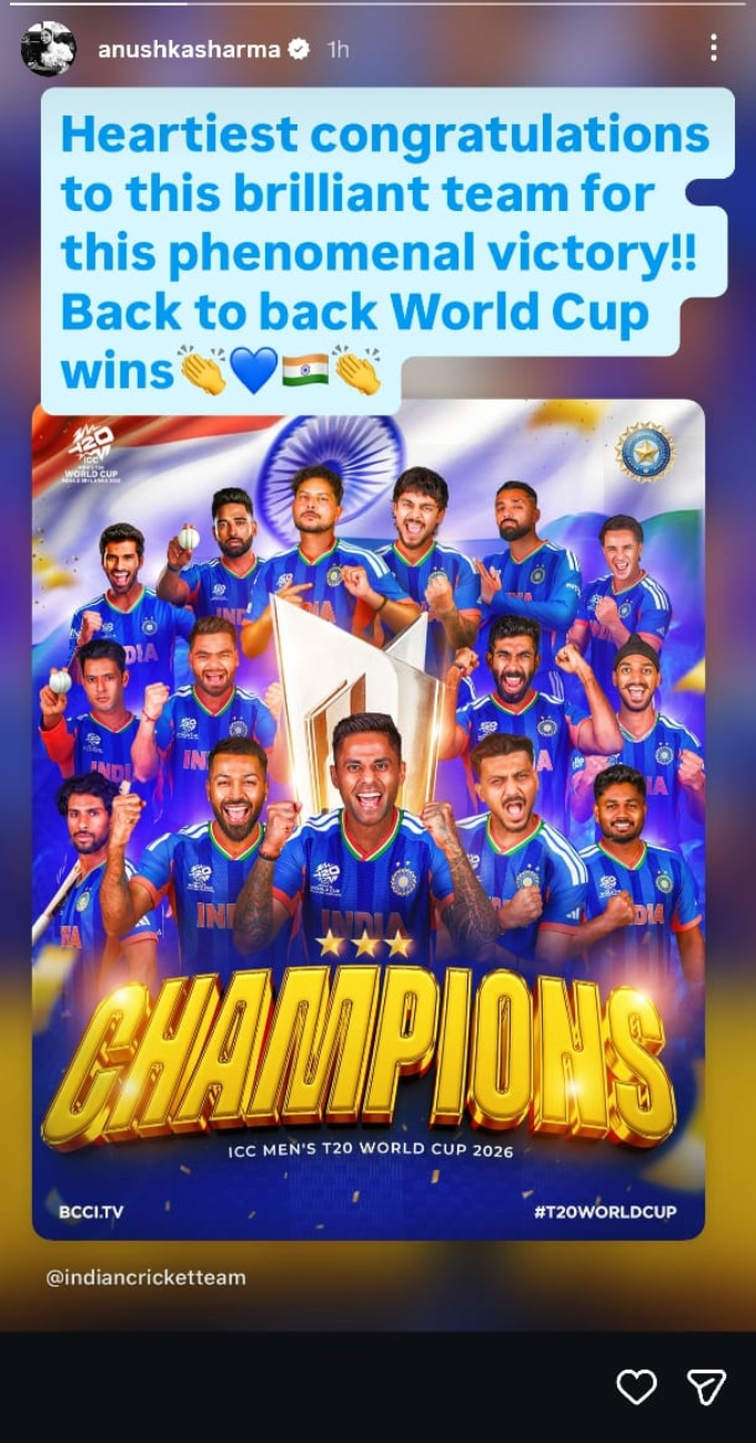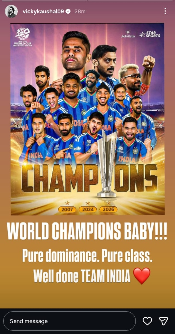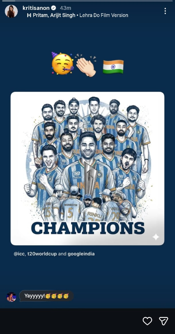 India re-wrote history as they lifted the ICC Men’s T20 World Cup yesterday by defeating New Zealand in a nail-biting final at the Narendra Modi Stadium in Ahmedabad. With more than 120,000 fans physically present in stands to witness the historic moment, the men in blue – led by Suryakumar Yadav, delivered a commanding performance and winning the title for a consecutive time. While millions across the globe celebrate Team India’s win in the T20 World Cup final, several Bollywood celebs took to social media to also congratulate the team and join in the celebration. Scroll below to check out some reaction, posts and stories of B’Town’s finest.