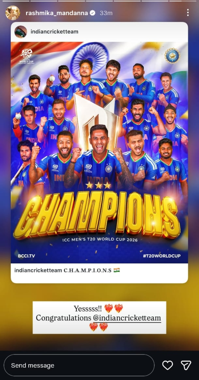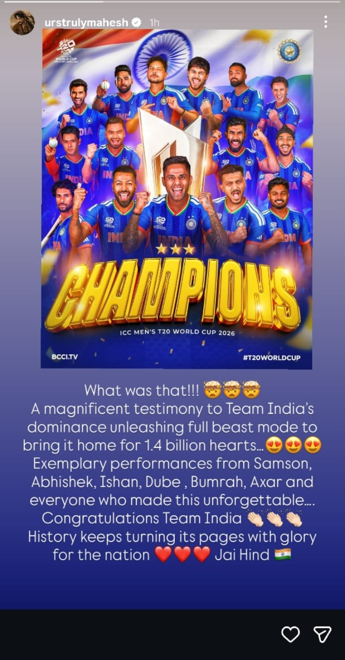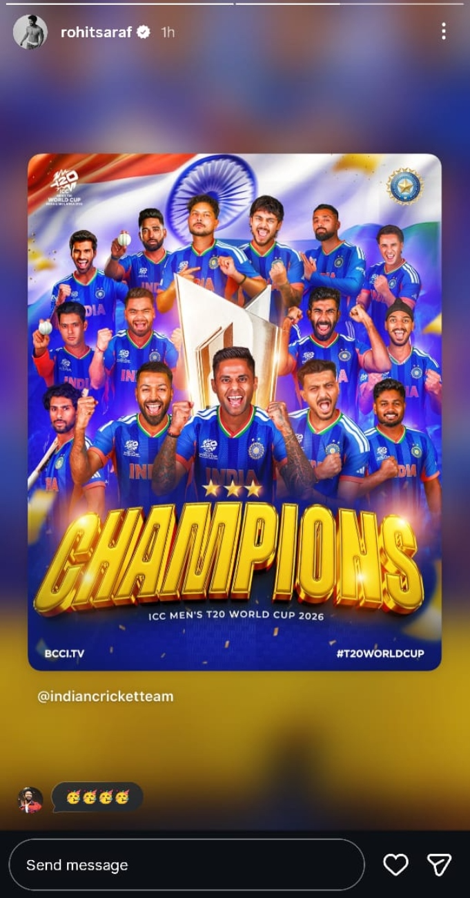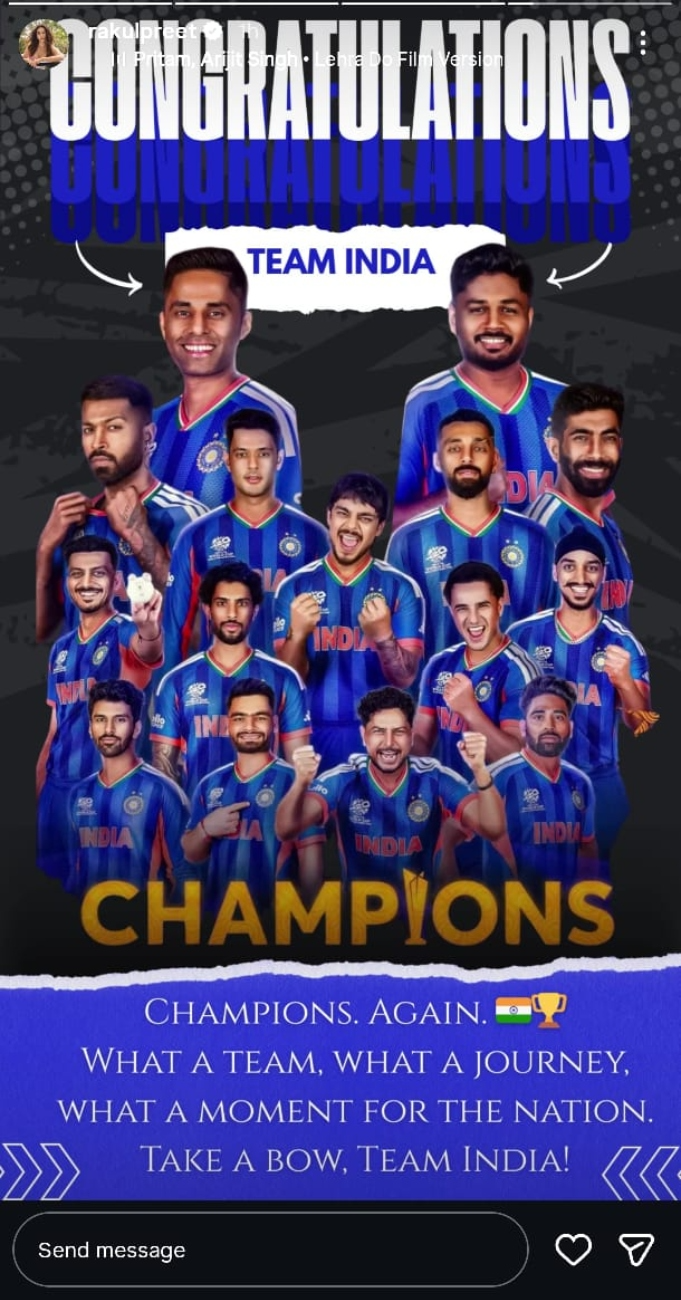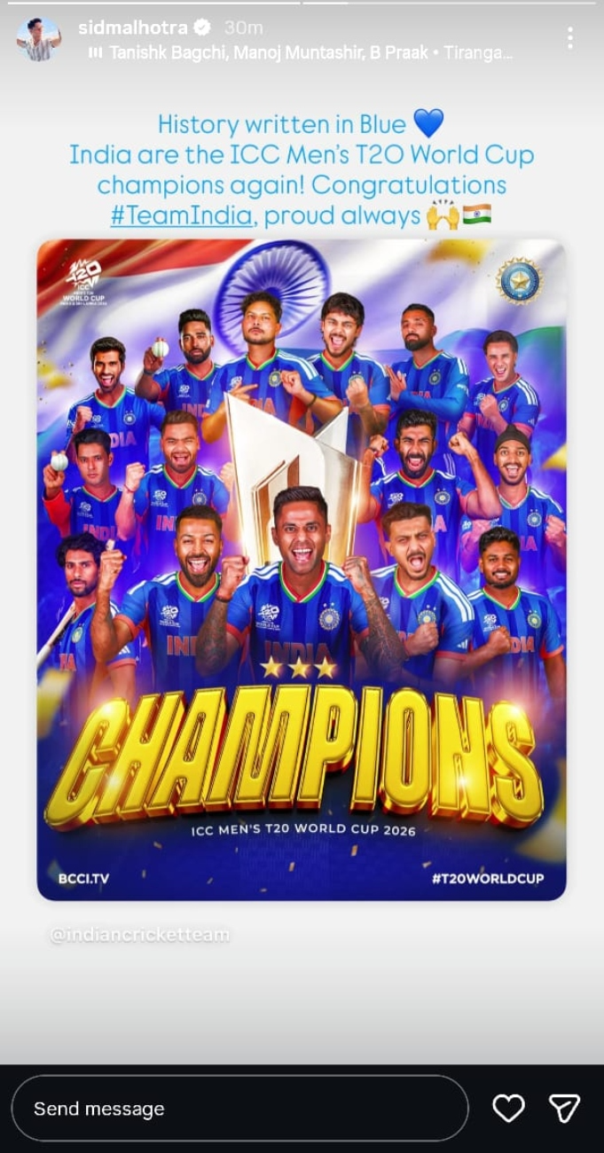 India re-wrote history as they lifted the ICC Men’s T20 World Cup yesterday by defeating New Zealand in a nail-biting final at the Narendra Modi Stadium in Ahmedabad. With more than 120,000 fans physically present in stands to witness the historic moment, the men in blue – led by Suryakumar Yadav, delivered a commanding performance and winning the title for a consecutive time. While millions across the globe celebrate Team India’s win in the T20 World Cup final, several Bollywood celebs took to social media to also congratulate the team and join in the celebration. Scroll below to check out some reaction, posts and stories of B’Town’s finest.