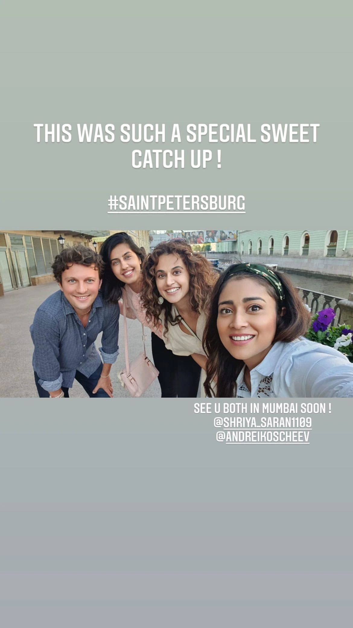 Taapsee Pannu, who has been enjoying her vacation in Russia, took to her Instagram stories to share that she recently bumped into Shriya and her husband Andrei on her trip. With the most adorable caption, the actress spoke about how it was a sweet catch up for her. Sharing a photo of herself, Shagun, Shriya and Andrei, she wrote, “This was such a special sweet catch up #StPetersburg. See you two in Mumbai soon (sic).”