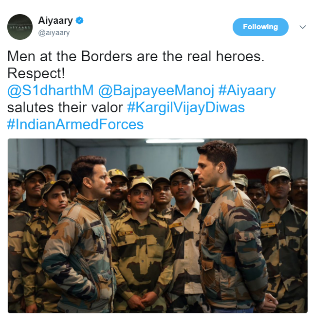 The makers of the film shared a still from the movie which has Sidharth Malhotra and Manoj Bajpayee facing each other, dressed as army men. Sharing the picture, they captioned, “Men at the Borders are the real heroes. Respect! @S1dharthM @BajpayeeManoj #Aiyaary salutes their valor #KargilVijayDiwas #IndianArmedForces.” [sic]