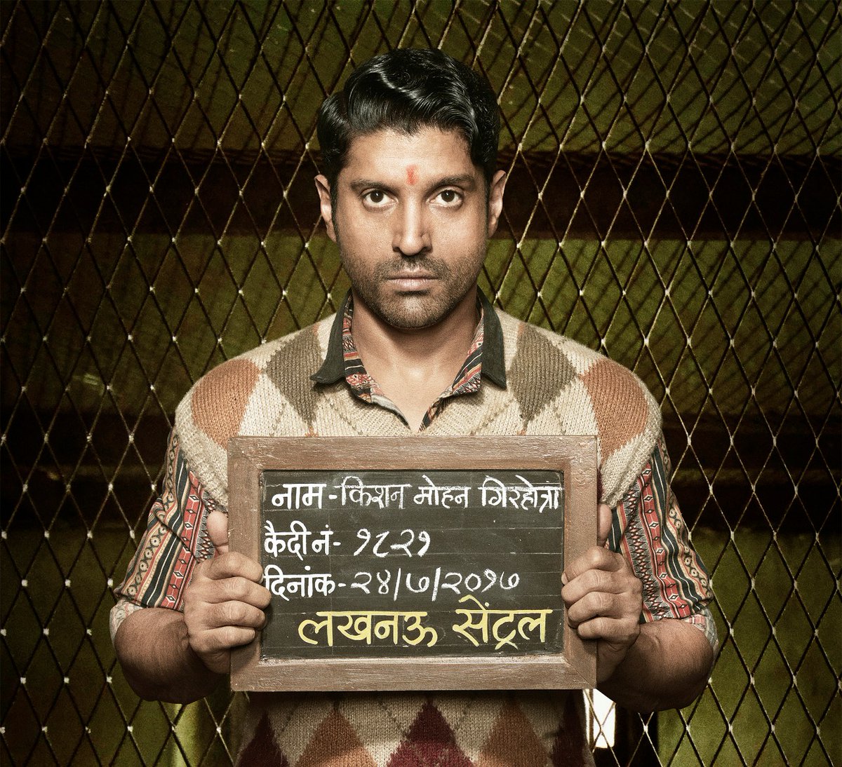 Here comes the first look of Farhan Akhtar from ‘Lucknow Central’. In the picture, we see him holding a jail placard which mentions his name as Kishan Mohan Girotra, his jail number and the date. It finally mentions the name of the jail, ‘Lucknow Central’. He is seen sporting a stubble, with a tilak on his forehead, and heavily oiled and sleeked-out hair. Have a look at the poster here: