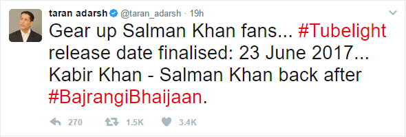 The release date was today announced by film critic Taran Adarsh on his social media account as he wrote, “Gear up Salman Khan fans… #Tubelight release date finalised: 23 June 2017… Kabir Khan – Salman Khan back after #BajrangiBhaijaan.”