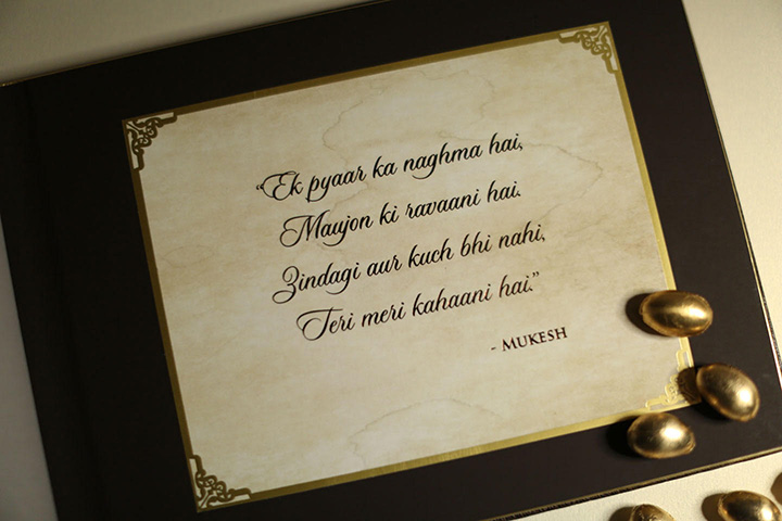 The wedding cards seem extremely special as it holds the famous songs of Neil’s grandfather Late Mukesh. The card has been designed as a coffee table book and every page of this book opens a new chapter. Every chapter has a foreword in the form of Mukesh’s songs.