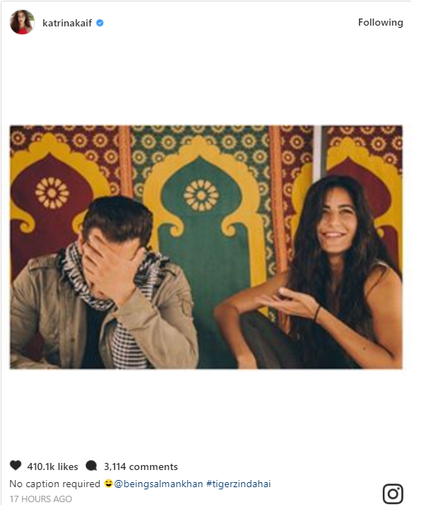 Actress Katrina Kaif has shared a cute picture from the sets of ‘Tiger Zinda Hai’. In the picture, we can see Salman and Katrina laughing over something and it’s a perfect candid click. Sharing the picture, she wrote, “No caption required ?@beingsalmankhan #tigerzindahai.” Have a look at the picture here: