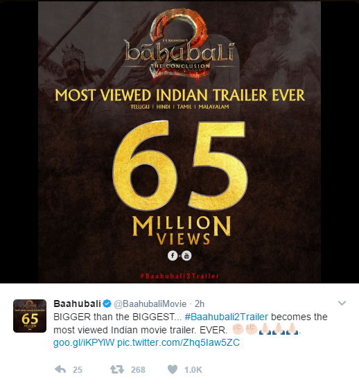 Director SS Rajamouli couldn’t hold back his excitement. He took to Twitter and wrote, “BIGGER than the BIGGEST… #Baahubali2Trailer becomes the most viewed Indian movie trailer. EVER.” (Also Read: ‘Baahubali 2 – The Conclusion’: Does the trailer give you feels of Rajinikanth’s ‘2.0’?)