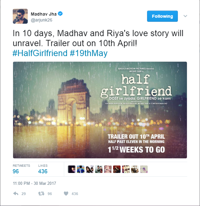 Directed by Mohit Suri, the trailer of ‘Half Girlfriend’ will make it to the internet on April 10, 2017. Arjun Kapoor took to his Twitter handle to share the same. Here’s what he posted,